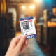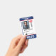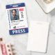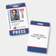 ID de pressionamento vertical com vermelho e azul como cores de destaque. Adicionar foto, logotipo, nome, título, número de ID e muito mais.