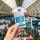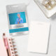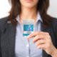 Um crachá de identificação comercial para empresas, incluindo uma foto pessoal, o logotipo da empresa e o nome comercial.