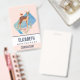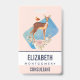 Crachá com um veado castanho bonito com um dorso branco. Um passarinho sentado nas costas do veado. Um buquê floral rico com rosas de aquarelas e folhas verdes-oliva claras sob os pés dos veados. Um retângulo de aquarela azul atrás da imagem. Pêssego fundo colorido.