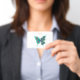 Borboleta verde fictícia, desenhada artisticamente, detalhada, com lindas penas de pavão verdes em fundo branco.
