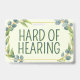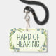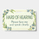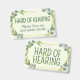 This badge features the slogan 'Hard of Hearing' surrounded by a wreath of eucalyptus leaves, on a pale green background. Below it gives specific instructions on how to interact with you. Default is 'please face me and speak clearly.' You can edit the text and colors as needed. 🍃 For more useful deafness accessories, visit my store Zazzle.com/Elder_Vitality 🍃 For custom orders, message me on Zazzle