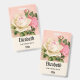 Crachá personalizado com um buquê de rosa floral com flores brancas e rosa. O fundo é rosa com um padrão floral. Bonito e elegante design.