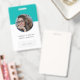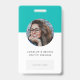 Crachá de identificação corporativa simples e elegante que pode ser facilmente personalizado com a foto do seu funcionário, nome, cargo, logotipo da empresa, detalhes comerciais e código QR ou código de barras. O design colorido e elegante apresenta tipografia minimalista moderna e uma faixa de bloco de cor em azul-teal verde para se destacar da multidão. A imagem mostrada é apenas para fins de ilustração e deve ser substituída por sua própria foto. A imagem de espaço reservado é de uma jovem mulher com cabelos castanhos ondulados e óculos.
