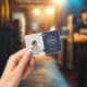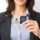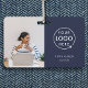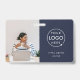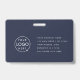 Crachá de identificação corporativo azul-marinho simples e elegante, que pode ser facilmente personalizado com a foto do seu funcionário, nome, cargo, logotipo da empresa e detalhes comerciais. O design preto elegante apresenta tipografia minimalista moderna e um design horizontal para se destacar da multidão. A imagem mostrada é apenas para fins de ilustração e deve ser substituída por sua própria foto. A imagem de espaço reservado é de uma mulher sentada em uma mesa usando um suéter náutico com uma xícara de café e um laptop na frente dela.
