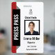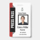 Crachá de imprensa profissional vermelho e preto com espaço para sua foto, nome, cargo, logotipo da empresa e código de barras. Perfeito para mídia, jornalistas, fotógrafos, equipe de eventos e passes de imprensa corporativos. Um modelo personalizável para notícias, equipes de produção e eventos especiais.