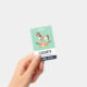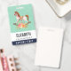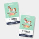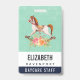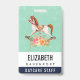 Placa de identificação personalizada com uma imagem encantadora e fantasiosa de um cavalo mecedor antigo com um lindo bouquet floral em rosa e amarelo. O fundo é um padrão de damasco xadrez verde claro.