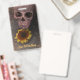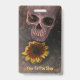 Este crachá de compro de tatuagem profissional com cabeça de crânio gótica apresenta um desenho antigo antigo sobre sépia, arte amarela de girassol design de Halloween. Imagem copyright Marg Seregelyi Fotografia.