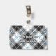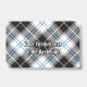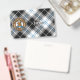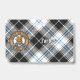 Crachá da crista Clan Forbes rodeado por uma correia e fivela sobre o fundo do tartan vestido. Texto personalizado de ambos os lados.