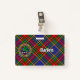 Crachá da crista Clan MacBeth cercado por uma correia e fivela sobre fundo tartano. Texto personalizado de ambos os lados.
