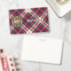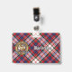 Crachá da crista Clan MacFarlane rodeado por uma correia e fivela sobre o fundo do tartan vestido. Texto personalizado de ambos os lados.