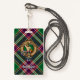 Crachá da crista Clan MacFarlane rodeado por uma correia e fivela sobre o moderno fundo tartano de caça. Custom Text.
