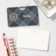 Crachá da crista Clan MacKay rodeado por uma correia e fivela sobre fundo azul-tartano. Texto personalizado de ambos os lados.