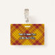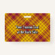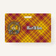Crachá da crista Clan MacMillan cercado por uma correia e fivela sobre fundo de tartã vestido. Texto personalizado de ambos os lados.