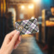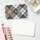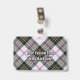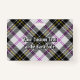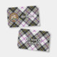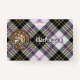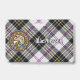 Crachá da crista Clan MacPherson cercado por uma pulseira e fivela sobre o fundo do tartan vestido. Texto personalizado de ambos os lados.