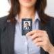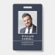 Crie uma aparência profissional com este crachá de ID clássico. Um design simples, combinado com letras elegantes e tradicionais, impresso em azul-preto e branco. Sua foto, nome, negócios e profissão personalizados estão na frente e suas informações de contato estão na parte de trás. Todo o texto pode ser personalizado ou excluído para que você possa incluir as informações desejadas.