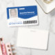Crachá de identificação azul marinho para trabalhadores essenciais da saúde e serviços aliados, personalizável com a foto, nome, cargo, logotipo da empresa, nome da empresa, número do funcionário e um código de barras para entrada em áreas restritas. Informações perdidas ou outras informações importantes no verso. Desenhado por www.mylittleeden.com