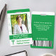 Estes crachás de identificação fotográfica têm um tema verde e branco. Eles incluem a foto do seu funcionário, o nome e o cargo na frente, além do nome do hospital/empresa. Você também pode optar por manter o caducamento ou substituí-lo pelo seu logotipo personalizado. O verso inclui espaço para informações "se encontradas" (incluindo endereço e número de telefone), além de espaço para um número de identificação e um código de bar. Use o modelo fácil para personalizar e, em seguida, use a ferramenta design para fazer alterações mais detalhadas (como ajustar o tamanho do logotipo ou código de barras ou excluir e reorganizar elementos). Esta design é perfeita para uma enfermeira, enfermeira, médico ou qualquer pessoa no campo médico.