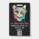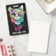 Uma imagem vibrante de uma cabeça de gato com óculos de sol espelhados e respingos de tinta é o fundo perfeito para um distintivo de festival de show de passe de bastidores VIP personalizado. Pode ser personalizado com qualquer imagem, código QR e texto para se adequar ao seu evento. Ótimo para conferências, festivais, shows de música e eventos de arte.