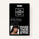 Um moderno crachá de negócios minimalista personalizado com logotipo de negócios, código QR e detalhes. Personalize com seu logotipo, código QR e detalhes para criar seu próprio crachá de negócios preto elegante e exclusivo. Personalize ainda mais com um fundo ou fonte de cor personalizados.