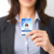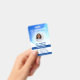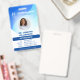 Blue Photo Business Hospital QR Code Modelo de Crachá de ID do funcionário do QR para personalizar facilmente o design para tornar seus crachás totalmente exclusivos. Texto personalizado adicional localizado no verso para obter informações adicionais. Código QR personalizável no verso.