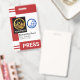 A capa apresenta uma faixa de coluna vermelha na parte superior e inferior do crachá. Na parede esquerda do crachá há um placar especial que contém um modelo de foto. Aqui você pode carregar fotos com medida de 1.000 x 1.200 pixels. A coluna especial que segura sua foto ajudará se o fundo da sua foto for branco. À direita da foto há um logotipo de globo azul opcional que você pode usar. O logotipo é baseado em um conceito de design de "mundo quebrado". Isso é seguido pelo seu nome, cargo e número de funcionário na parte inferior. Uma legenda "IMPRENSA" pode ser encontrada perto da base no canto inferior direito, altere-a para atender às suas necessidades de serviço.