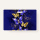 Composição de borboletas luxuosas de safira e joias de ouro em fundo azul texturizado.