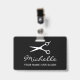 Compro de barbearia personalizado e Crachá do nome do funcionário do cabeleireiro. Tipografia de script clássico e cor de fundo personalizada. Design elegante para cabeleireiro, cabeleireiro, barbeiro, empregado, colega, pessoal, funcionarios, etc. Logotipo da silhueta de tesoura de barbeiro profissional. Adicione o seu próprio slogan comercial ou nome da empresa. Cores pretas e brancas ou personalizadas.