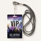Perfeito para concertos e grandes eventos, este crachá personalizável apresenta um fundo de concertos e luzes com sobreposições de texto branco. Personalize para VIPs, funcionarios, pressione ou outros usos, com três linhas de texto na frente. Adicione informações adicionais sobre eventos à parte traseira do crachá em letras brancas em preto.