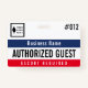 O visitante passa crachá com um simples design preto, branco, azul marinho e vermelho. O convidado autorizado é escrito através do crachá convidado, mas você pode mudar o texto para atender às suas necessidades. Personalize ainda mais com o logotipo de sua empresa e o nome da empresa.