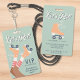 Convite de aniversário de patinação divertido em verde sálvia com crachá VIP "Acesso Total" e lembrancinha para qualquer idade com "Vamos Rolar!" em letra cursiva branca, ilustração inspirada nos anos 70 de patins laranja claro em uma garota de pele escura usando meias tubulares listradas de rosa e tipografia azul escura moderna. A frente serve como crachá para as meninas usarem durante a festa. Adicione os detalhes do convite no verso.