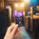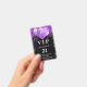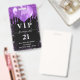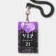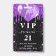 Um crachá moderno, na moda e glamouroso para uma festa de aniversário 21 (ou qualquer idade). Um fundo preto com brilho púrpura, pingos, pintura pingando e balões. Com o texto: VIP. Personalizar e adicionar nome, idade, endereço/data. O nome é escrito com um moderno e escuro, rosa dourado, escrito em estilo manuscrito, com traços. Para manter as hastes, exclua apenas o nome da amostra, deixe os espaços ou emoji na frente e depois do nome. Traseira: sem design ou cor (menos caro)