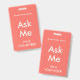 Crachás vermelhos brilhantes "Pergunte-me" para voluntários, professores, centavos, guias, organizadores de eventos para eventos especiais, como casamentos, feiras de artesanatos, shows de casas e jardins, eventos de caridade, funções empresariais e corporativas. A cor da tipografia é marfim pálido que dá a este crachá uma aparência moderna. Fácil de personalizar!