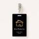 Crachás de ID associados em ouro em preto com símbolo de casa dourado impresso digitalmente para se parecer com trabalho de arte de metal ouro e modelos de texto que você pode personalizar online. Use o símbolo da casa nos crachás ou substitua-o pelo logotipo ou imagem gráfica da sua própria empresa. Projetado para um agente imobiliário, agente de fechamento de empresas de títulos ou gerenciamento de propriedades.