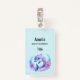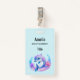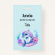 Nome crachá com uma ilustração adorável. Um golfinho azul e roxo cercado por bonito plantas submarinas coloridas.