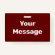 Você pode criar sua própria mensagem em texto branco neste crachá vermelho escuro.