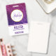 Crachá com um design sofisticado e elegante. O fundo é composto por cristais de brilho rosa e roxo. Estilo feminino e moderno. Um círculo com uma borda de folha de ouro falso sobreposta com seu nome e inicial dentro.
