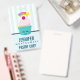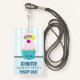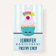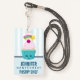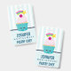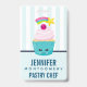 Crachá de nome com um padrão listrado azul claro e branco emparelhado com um padrão de bolinhas azul e rosa. Camadas sobre o topo é um cupcake azul giro com glacé rosa e um rosto sorridente kawaii. Uma cereja em cima também tem um rosto feliz fofo. Uma estrela cadente está voando no ar