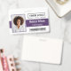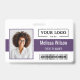 Try this professional horizontal ID badge design for a structured and tech-ready look. The layout features a clean white background, contrasting sharply with a bold purple horizontal bar that displays the individual's name and title with great visibility. A dedicated, clean area on the right is reserved for your company logo, while the bottom is strategically spaced to include a barcode or QR code for easy scanning access.