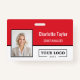 This horizontal ID badge design makes a vibrant, high-energy statement with a bold color block of bright red and crisp white. The layout strategically features the employee's photo on the left, which is perfectly balanced by the name and title clearly displayed in white against the red background. With a prominent space for your company logo on the white panel, this modern style ensures high visibility and immediate recognition.