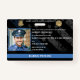 The customizable police department ID badge features a police emblem at the top that can be customized to your department as well as a place for the state logo as well. Customize with the officer's photo on the left. Beside the photo, the officer’s name, badge number, rank, and department are displayed. Add your own barcode to the back of the card, along with issue and expiration dates, and description of the officer, captain, chief, or office employee.