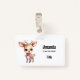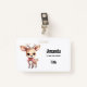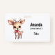 Name tag with an illustration of an adorable baby deer. Big eyes big ears with a large head and little brown antlers. Wearing a big red bow.