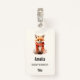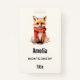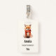 Name badge with an illustration of a reddish orange fox pup. A subtle smile on his face. Wearing a nice red scarf for warmth.