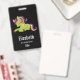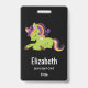 Crachá personalizado com uma imagem de um unicórnio estilo Frankenstein. Cor roxa e verde. Muito fofo.