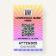 Crachá de eventos de conferência amarelo, rosa e roxo do Starburst com lugar para o código QR do seu evento, logotipo, designação do participante e detalhes do nível de acesso.