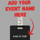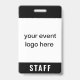 Personalize este crachá simples e moderno para a equipe do evento com o seu logotipo. Se o seu logotipo for quadrado, ele preencherá todo o espaço branco. Se o seu logotipo não for quadrado, ele será exibido em um fundo preto. A parte de trás do crachá pode ser personalizada com o nome do evento e data ou ano, ou você pode excluir ambos para ter uma parte de trás totalmente preta. Este crachá minimalista é ideal para funcionários em eventos especiais, festivais, shows e convenções.