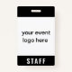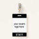 Personalize este simples crachá de funcionarios de eventos moderno com seu logotipo. Se o seu logótipo for quadrado, preencherá inteiramente o espaço branco. Se o seu logotipo não estiver quadrado, aparecerá em fundo preto. A parte traseira do crachá pode ser personalizada com o nome do evento e a data ou ano, ou você pode excluir ambos para ter um todo preto de volta. Este crachá de funcionarios minimalista é ideal para funcionários em eventos especiais, festivais, concertos e convenções.