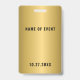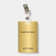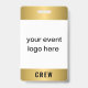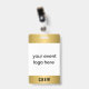 Personalize este falso crachá de funcionarios de tripulantes de eventos metálicos em ouro com o seu logotipo. Se o seu logótipo for quadrado, preencherá inteiramente o espaço branco. Se o seu logotipo não estiver quadrado, aparecerá em fundo dourado. A parte traseira deste crachá pode ser personalizada com o nome do evento e a data ou ano, ou você pode deletar ambos para ter todo o ouro de volta. Este simples e minimalista crachá de funcionarios de tripulações é ideal para eventos especiais, festivais, concertos e convenções.