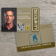 Crachá de identificação profissional para oficiais de segurança privada com nome, título, foto, código QR, número de identificação e data de validade. Inclui a marca da sua empresa e detalhes de contato no verso. Um design elegante em marrom e dourado ideal para uniformes formais e patrulha de local.