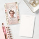 Crachá de identificação profissional de fotos em quadrinhos com sua foto e logotipo personalizados em um fundo cor-de-rosa floral. No verso, você pode adicionar um código de bar personalizado e um código QR e textos adicionais ou excluir os modelos.