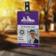Crachá de funcionário vertical com uma cor de destaque roxa. Adicione foto, 2 logos, nome, cargo, número de identificação e mais para um crachá de identificação profissional. Um crachá de funcionário prático e profissional personalizado com foto, um logotipo maior e um logotipo menor, juntamente com cargo, nome da empresa e nome.